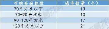 三四线城市中可购买面积低于70平方米的城市有13个,70-90平方米的城市有13个,90-120平方米的城市有17个,120平方米的城市有21个。