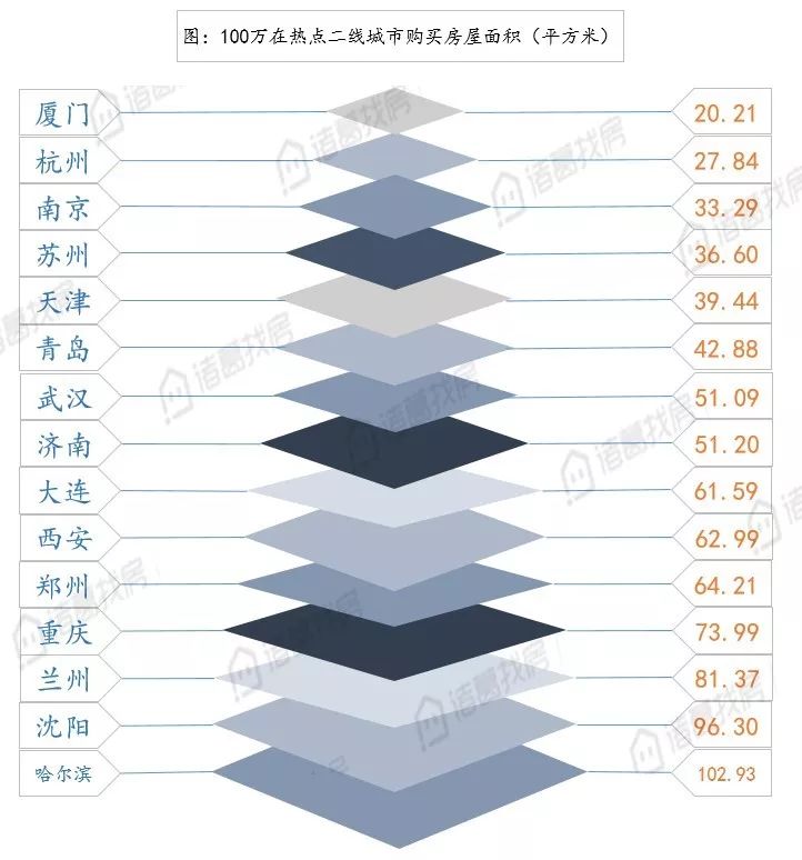 三、100万在二线城市可购买面积在20-141平方米不等,厦门、杭州两城是二线城市中购买力最差的城市