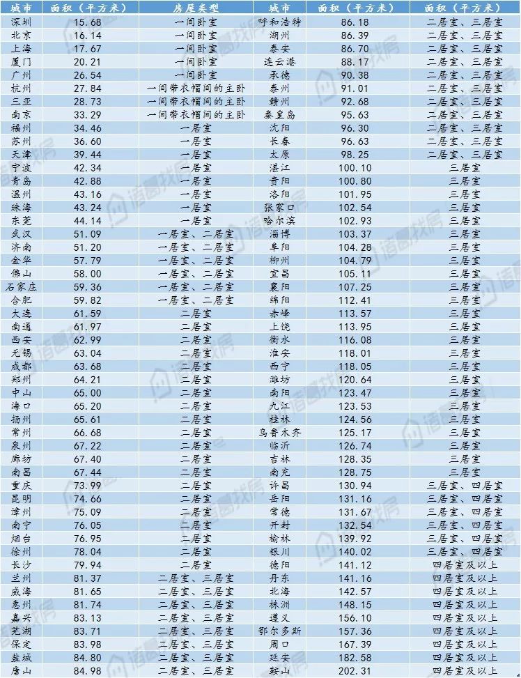 南京、福州、苏州、天津、宁波、青岛6城可购买面积在30-50平方米之间。