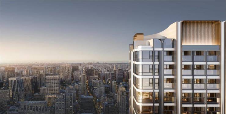 建筑南向立面,4根南向展开的“华之柱”气派非凡,以米白色幻彩铝板辅以最新光学工艺,赋予建筑璀璨灵动的生命力。[弧形钻幕]创新呈现“空中悬浮全景舱”,270°转角弧形飘窗打造IMAX视野,可远眺陆家嘴三件套,并开创性地设计新一代三阳台,享有超绝的窗墙比,室内空间尺度、实用性也做开拓到极致。