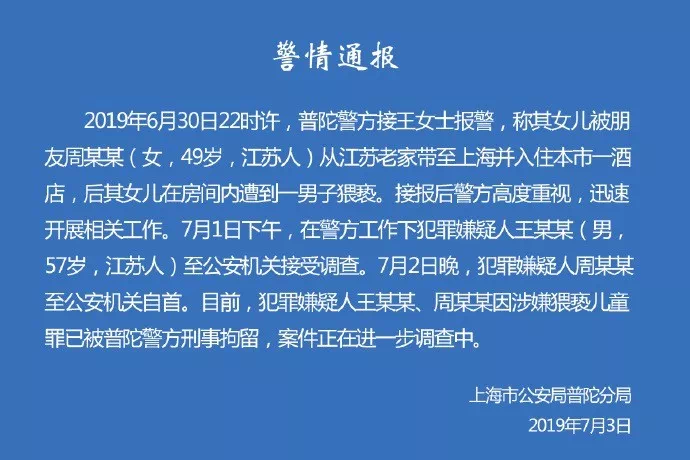 2019年7月3日,上海市公安局普陀分局发布警情通报:2019年6月30日22时许,上海普陀警方接王女士报警,称其女儿被朋友周某某(女,49岁,江苏人)从江苏老家带至上海并入住本市一酒店,后其女儿在房间内遭到一男子猥亵。接报后警方高度重视,迅速开展相关工作。