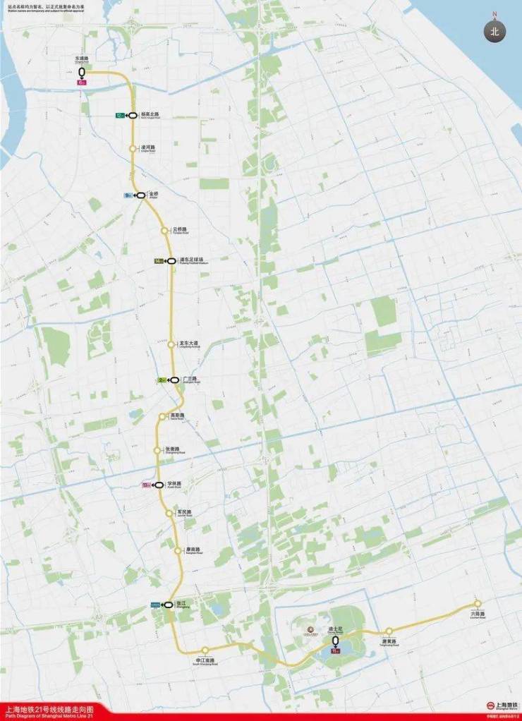 21号线一期,位于浦东新区范围内,起于上海国际旅游度假区东侧的六陈路站,终于浦东高行的东靖路站,途经川沙新镇、康桥镇、张江镇、金桥镇、高行镇,串联了国际旅游度假区、张江科学城、金桥出口加工区这三大功能区,及张江副中心、金桥副中心两个主城副中心。线路全长约28公里,均为地下线,共设18座车站。
