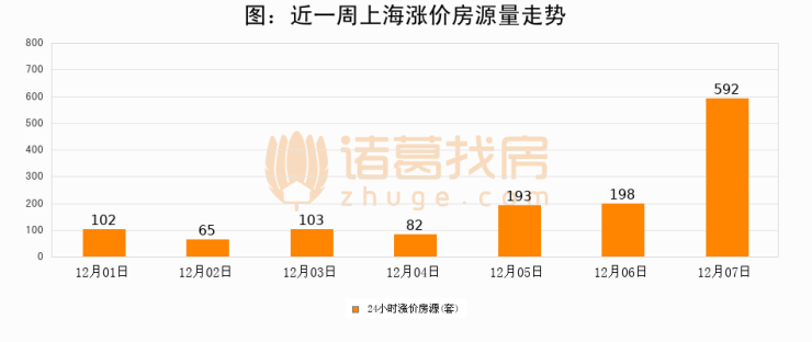 根据诸葛找房数据显示,上海24小时涨价房源量为592套,较12月06日增加394套,环比上涨199%。与此同时,涨价房源占比小幅扩大,业主信心有所提升。