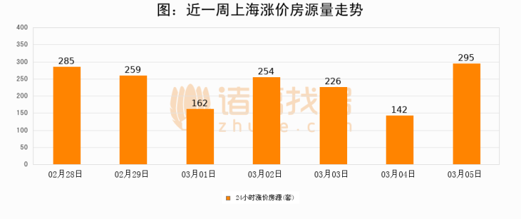 根据诸葛找房数据显示,上海24小时涨价房源量为295套,较03月04日增加153套,环比上涨107.7%。与此同时,涨价房源占比小幅扩大,业主信心有所提升。