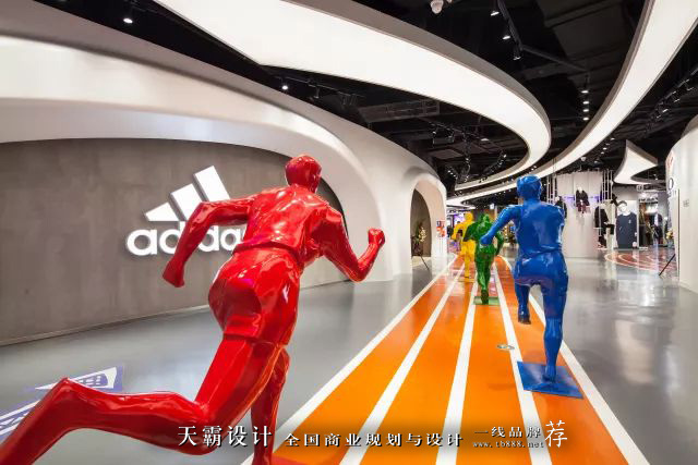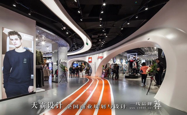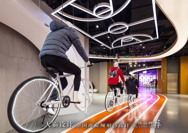 除了石库门街区、英伦风情街、女性主题街区以及文创区域等主题街区外,上海五角场万达广场另辟蹊径新设了1万平米的运动主题街区。运动馆的内部空间布局呈现潮流时尚的风格,设计颜值颇高,地面铺设了一条长跑道、曲线光带与地面呼应,品牌门头由弧形曲线构成,看起来相当流畅。