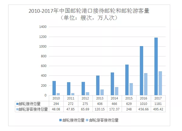 2017年全年接待邮轮游客量为495.42万人次,较2016年增加38.76万人次。整体市场规模扩张速度较快。