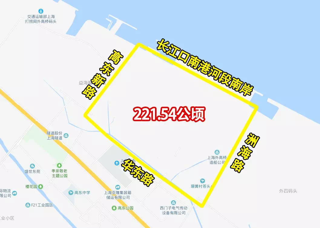《 上海市浦东新区外高桥船厂PDP0 一 0203单元13街坊控制性详细规划 》中公示:本次规划范围为上海市浦东新区高东镇外高桥船厂PDP0一0203单元13街坊,东至洲海路,西至高东新路,北至长江口南港河段南岸,南至华东路,用地面积为221.54公顷。