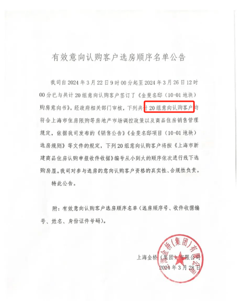据了解,上周结束认购的金鼎睿府通过官微“上海金鼎”官宣了最新一期房源的认购结果:636套房源,收获20组意向认购客户。换算下来,认购率只有约3%,令人大跌眼镜。更惊讶的是,其后,这一公告很快又被删除。