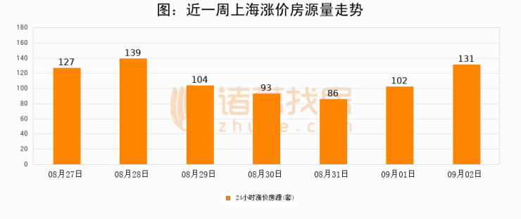 根据诸葛找房数据显示,上海24小时涨价房源量为131套,较09月01日增加29套,环比上涨28.4%。与此同时,涨价房源占比小幅扩大,业主信心有所提升。