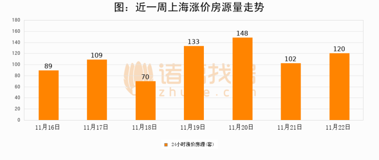 根据诸葛找房数据显示,上海24小时涨价房源量为120套,较11月21日增加18套,环比上涨17.6%。与此同时,涨价房源占比小幅扩大,业主信心有所提升。