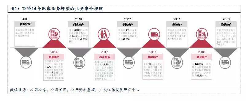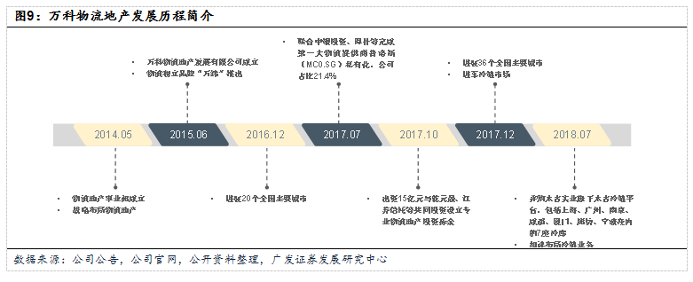 2014年5月,万科成立物流地产事业部,标志着公司正式战略布局物流地产。2015年5月,万科首次公布物流地产项目获取情况,并在当年6月成立万科物流地产发展有限公司,同时推出物流独立品牌“万纬”。事业部上升为子公司,既表明了万科进军物流地产的决心,同时也意味着物流地产从辅助支撑性职能开始向现金流核心营收业务进行转变。2017年之后,万科加大了外延式并购力度,2017年7月联合私有化排名前列大现代物流服务提供商普洛斯,公司占比21.4%。进入2018年,万科再次并购太古实业旗下冷链平台,获取上海等地7座冷库,完善了冷链业务的布局。