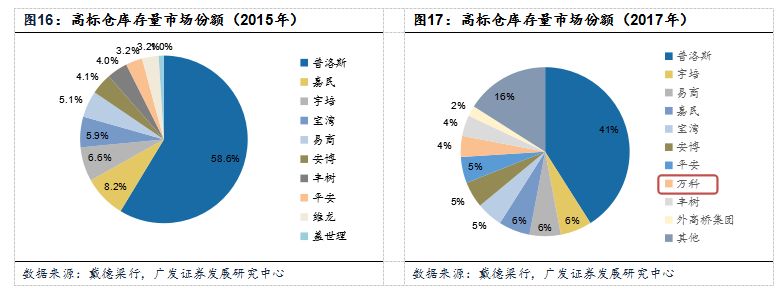 排名前列,万科住宅销售回款以及多元化的融资渠道为物流地产的扩张提供了前端的资金支撑。2015年,万科物流地产的可租赁面积仅为51万方,到2017年可租赁面积已经扩张至482万方,市场份额已达4%,三年跻身第二梯队。