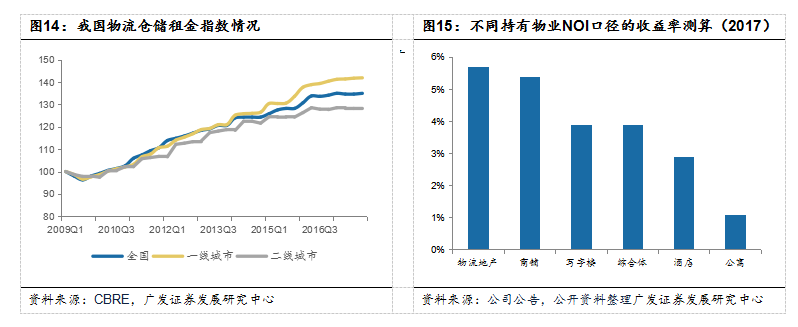 然而我国物流仓储设施供给结构失衡较为严重,根据世邦魏理仕数据,我国高标库严重匮乏,市场供应主体绝大多数为“农民库”,不满足现代物流的需求,人均拥有的高标仓储面积与美国差距巨大。持续供不应求的状态,推动物流地产租金水平稳步上升,并且从投资回报率的角度看,物流地产NOI(租金扣除运营费用)口径的回报率高于其他持有型物业。