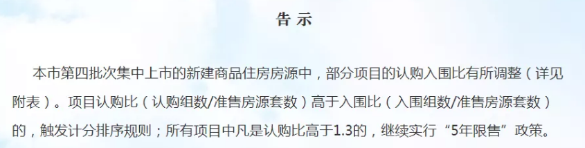 8月27日,上海网上房地产突然发布一则《告示》,宣布调整第四批新盘中部分楼盘的入围比例。共有17个楼盘调整了入围比例,从之前的1.3调整至1.8~2.5不等,意味着低分选手入围的几率变高,而高分者选房难度则增加。从此次从入围结果来看,瑞安翠湖和中信九庐都是2.5倍。