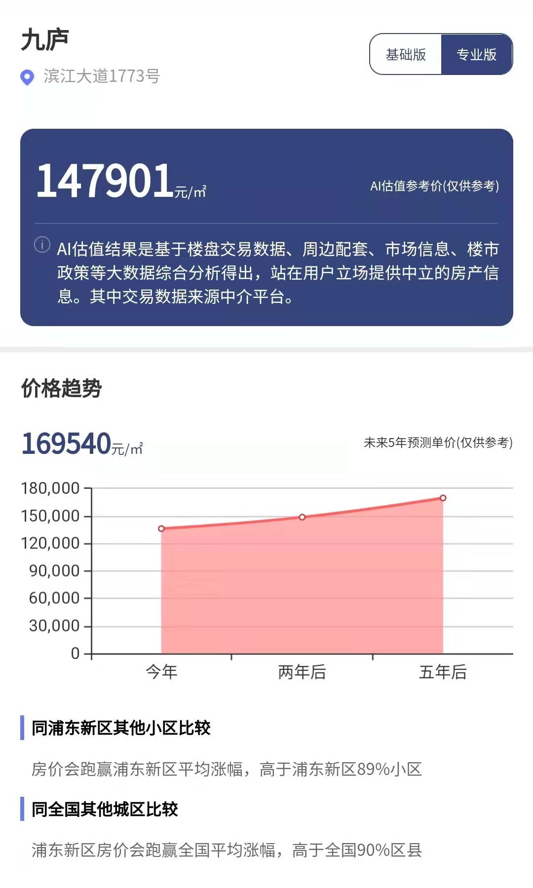 每经AI品房小程序数据显示,九庐目前的估值参考价为147901元/平方米,未来5年的价格约为169540元/平方米。