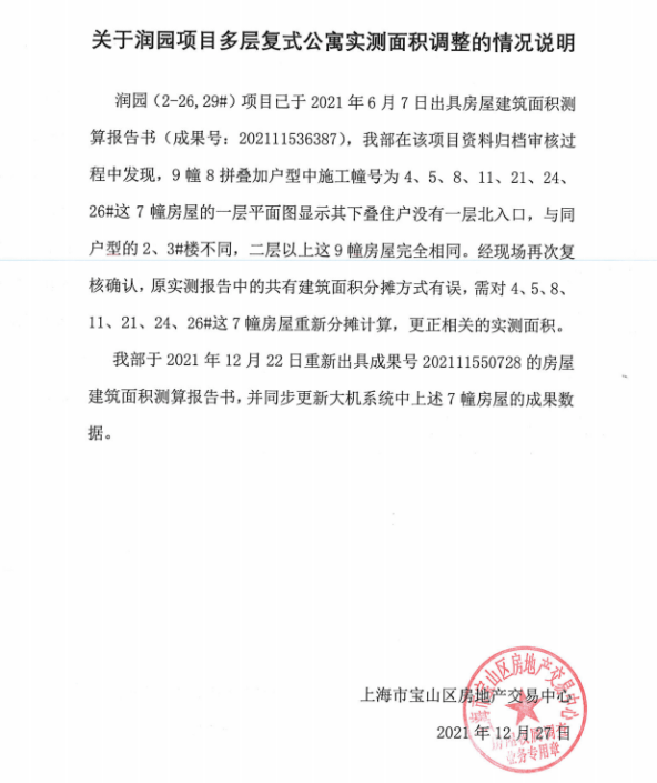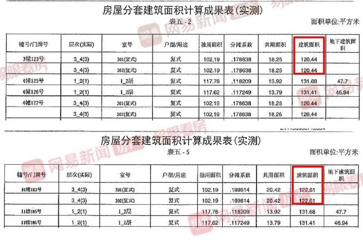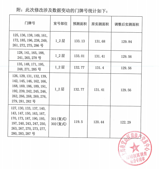 网易房产据业主提供的资料获悉,复测报告显示,此前建筑面积约120.44平的上叠户型经过实测后建筑面积调整为122.29平。