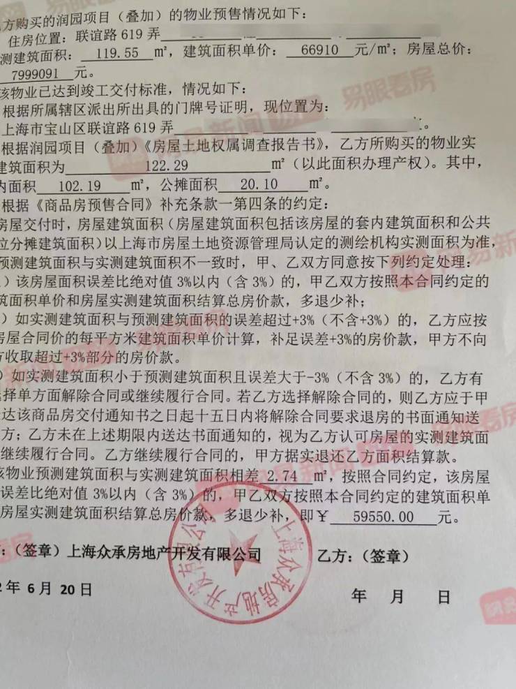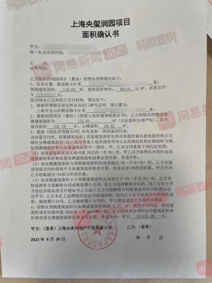 因此在7月19日开盘当日,购买了建发央玺叠加别墅的购房者与开发商签订了一份面积补差确认书,初步确认了实测建筑面积和需要补缴的房款。由于上叠存在两种不同的建筑面积,实测面积与预售面积差在1-3平左右,交房后上叠业主分别要补齐房款差价约5-7万和约18-20万不等。