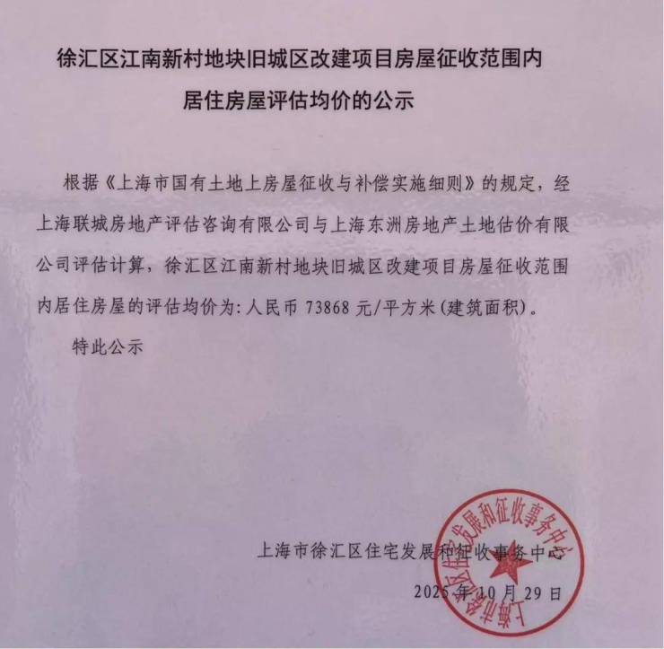 刚刚公示的江南新村旧改征收评估均价为73868元/㎡,略高于去年隔壁东安一、二村的72822元/㎡。这一基准价格的提升,反映了该区域土地价值的持续攀升。