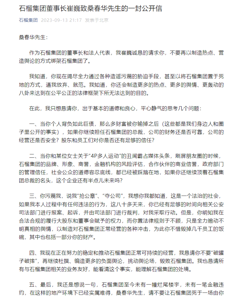 继9月13日深夜石榴集团公众号发布《石榴集团董事长崔巍致桑春华先生的一封公开信》,9月14日上午,石榴集团联合创始人桑春华在北京召开媒体沟通会,对日前崔巍发表的陈情书12条做出回应。