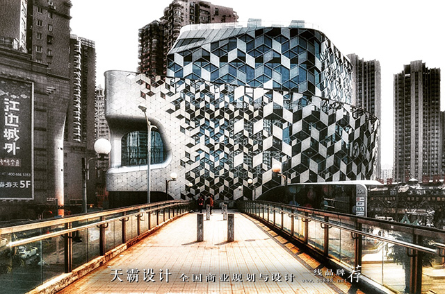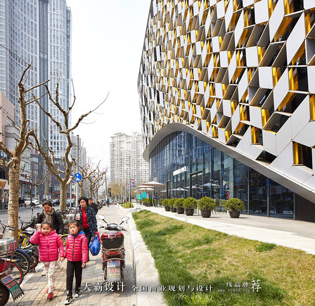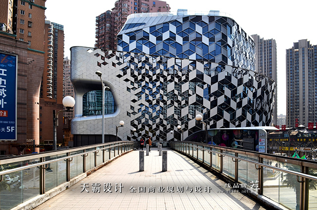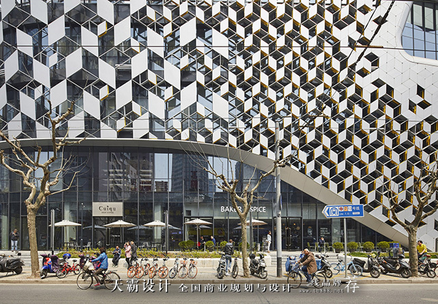 接下来,天霸设计小编想要与大家分析189弄购物中心的外立面设计方案。这个商业空间设计项目在外观的设计上,符合建筑的整体设计理念。我们可以看到,建筑的外观组件是按六边形网格的几何形状铰接在一起的,并创造出了不断变化的透视效果。