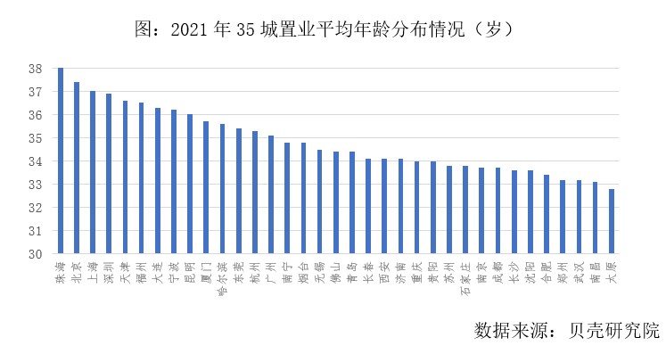 同时,对于一线城市而言,已经进入了存量房市场,刚需群体买卖交易以二手交易为主,而新房多为置换人群。因此,体现在年龄上,一线城市新房的平均年龄比二手房较高。从城市分布看,在35个样本城市中,置业平均年龄偏高的城市包括珠海、北京、上海、深圳及天津,以深圳、珠海及东莞为代表的大湾区城市置业年龄普遍偏高。