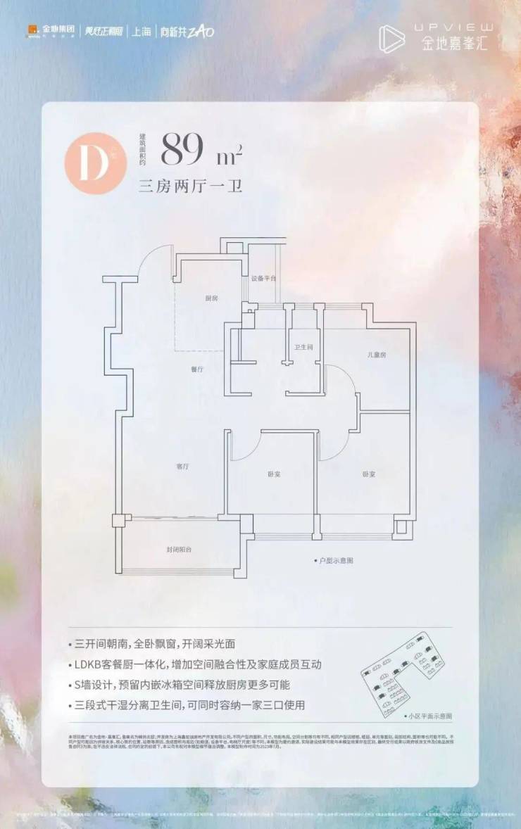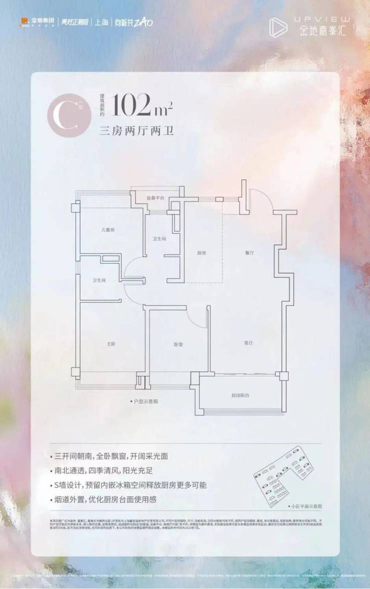 约102㎡3房三开间朝南,全明五开窗,端户的北次卧和南主卧都有L型飘窗,使得风景和采光更上一层楼;餐客厨一体化,S墙创新设计,释放更多空间;烟道外置,优化厨房台面使用感和转角柜体的使用效率;主卧套房设计,保障私密性与舒适性;客厅和次卧的非承重墙,可以自由改造,形成灵动空间,多方位演绎精致日常。