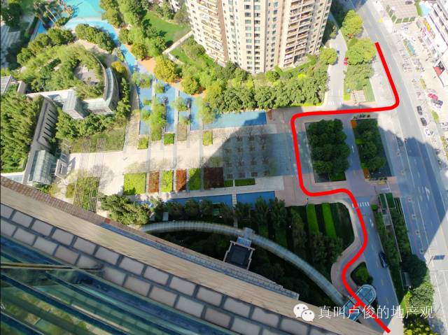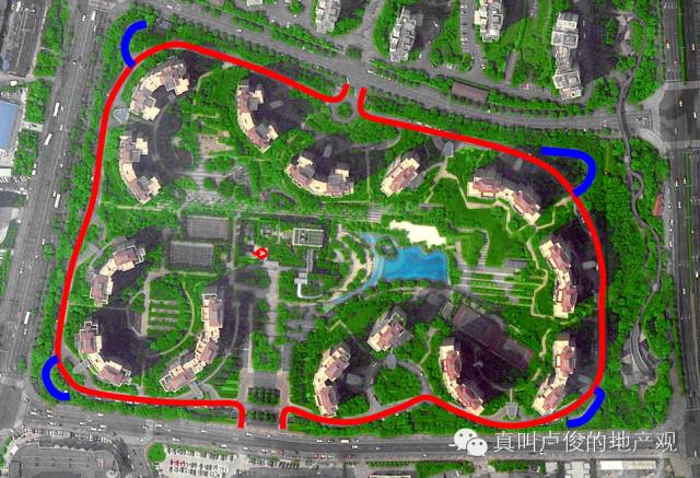 现在所有的项目都强调人车分流,把所有的行车路线都留到地下,地面全部人行。用这样的标准来打造一个高端牛逼的小区。我们看虽然他的围合式排布让大量的绿化都留给业主,但是我们看到这个小区的外围还是走车的