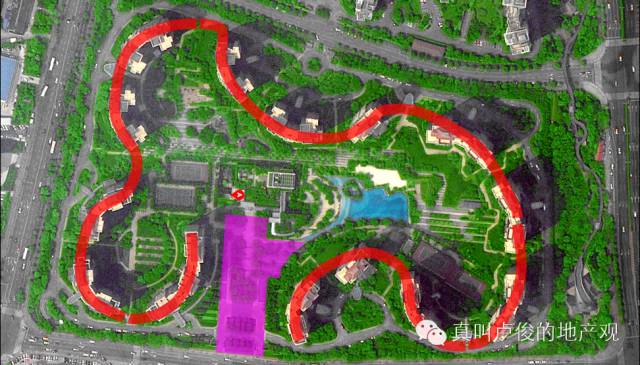 这样的亮点都不是营销阶段可以展示的。我们营销时候对外诠释的所谓景观,无非是说什么仪式感、什么五重绿化,还有什么狗屁同纬度移植之类的骗人故事,然后通过样板段堆砌一个假象。仁恒的这个项目所有的一切都是和营销相违背的,而一个理性的项目操盘手,应该会怎么规划仁恒这个项目呢?仁恒的邻居给了一个较大的答案