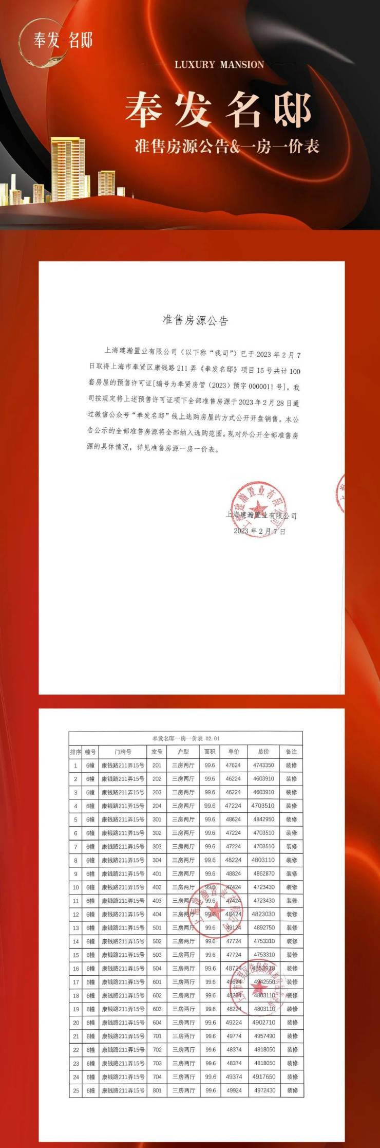 奉贤“地王”项目奉发名邸,首期推出96套毛坯高层,建面约83-112平2-3房,备案均价为47500元/平,入围分51.6,开盘日光。项目二期已取证,2月9日开始认购,均价为49900元/平,房源为6#,共1…