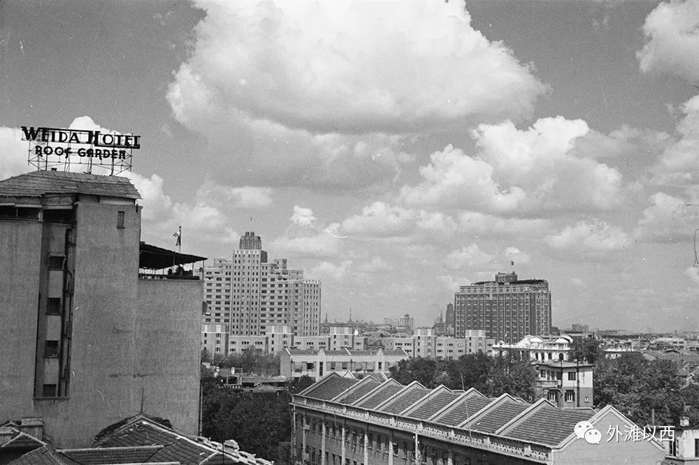 放大了看看,钱塘大楼的楼顶上没有了伟达饭店露台花园的广告牌,五个大字,天天喊的。高塔公寓和西隔壁的大飞檐中国风格建筑都在的;上海音乐学院内的苏联式集合楼也在的。