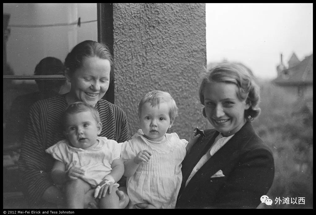 "Mei Fei Rosholt (center) in picture taken by her daddy in Shanghai, China, in early 1937, with her mother, Marge, smiling, while Sandra Forman holds Brenda Lu, her first-born. Picture taken at Weda Apartments, Avenue Joffre, French Concession. Harrison Forman was cameraman and news correspondent. [...]."
