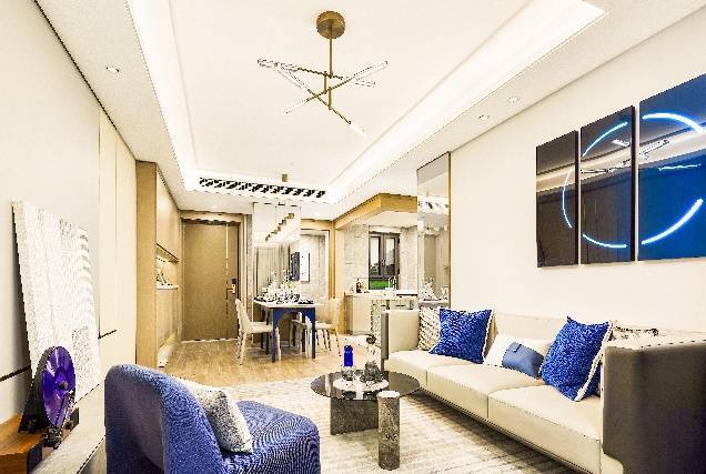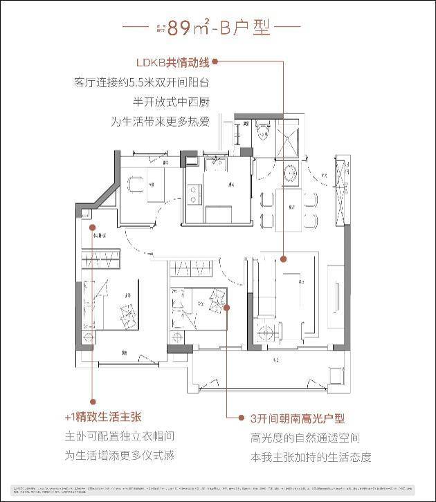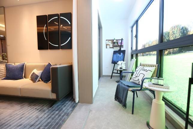 两人世界充满浪漫,89㎡三房,开间约5.5米的阳台,除了满足家政晾晒需求,还可以豢养各种爱宠,无论英短、二哈、还是各种盆栽,猫猫狗狗、花花草草,阳台成为生活中最“治愈”的一个角落。而年轻家庭的“客厅” 也可以长得不像“传统客厅”,一个双人沙发,一台高清投影仪和一块幕布就构成一个“周末午夜剧场”。而主卧+1的灵动空间还可以作为女主人的“衣帽间” 。在这个户型里年轻人想要的浪漫、仪式感都有了。