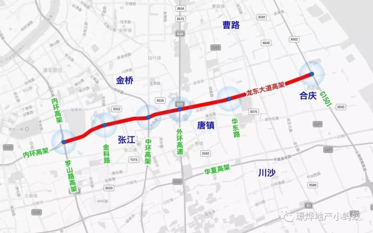 在立交与匝道分布方面,根据较新的张江科学城建设规划与合庆2040总体规划,较为明确的出入口共有6个,由西向东分别是:内环罗山路、金科路、中环申江路、外环S20、华东路与郊环G1501,具体的出入口分布情况以后期的工程设计方案为准。龙东大道快速化工程是浦东综合交通“十三五”规划实施建设项目之一,为了迎合浦东机场远期扩建至8条跑道,龙东大道未来还将继续往东延伸至海边,并沿着海岸线经过三甲港外围,往南通往浦东机场新航站区与上海东站,成为浦东机场及祝桥交通枢纽的重要进场通道,将对华夏高架路、外环线起到明显的分流作用。