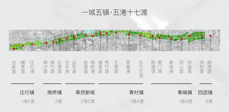 “一川烟雨”以浦南运河作为中轴水脉,东至庄行,西至四团,全长33公里,沿线已规划“五港十七渡”,奉城老城、四团老街、庄行老街、青村老渡口、南桥六敦村都被纳入其中。600年庄行古镇所在位置,正位于奉贤“一川烟雨”新江南画卷的卷首。