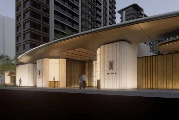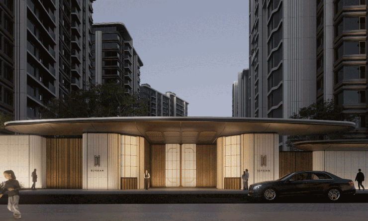 社区大门的优美的建筑弧度,来源于希腊One&Only 的唯逸度假酒店,让建筑犹如灵动飘逸的缪斯裙摆;在材料色调上,集萃上海文脉的“摩登金”,映射了十里洋场的复古韵味,与贝金米黄、香槟玉石等天然奢石 交相辉映,形成温润 而精致的美学触感。