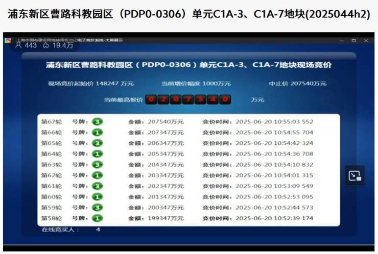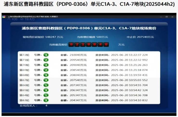 6月20日上午,浦东新区曹路科教园区(PDP0-0306)单元C1A-3、C1A-7地块进入现场交易环节。上海土地市场官网对该地块出让过程进行了直播。