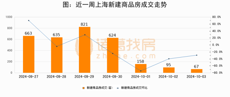 根据上海市房地产交易中心数据显示,2024年10月03日上海新建商品房成交67套,较昨日减少28套,环比下降29.5%
