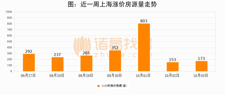 根据诸葛找房数据显示,上海24小时涨价房源量为173套,较10月02日增加20套,环比上涨13.1%。与此同时,涨价房源占比小幅扩大,业主信心有所提升。