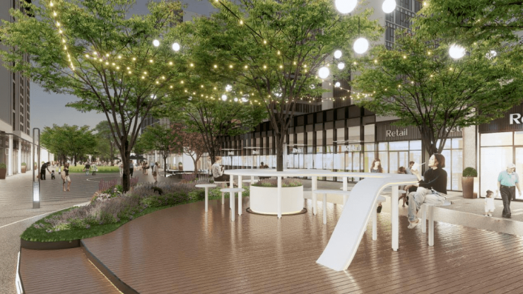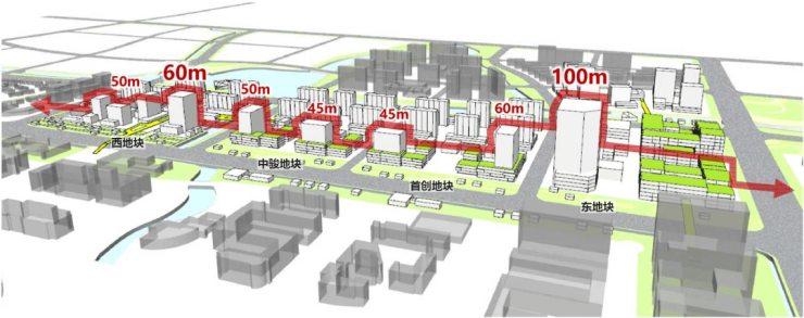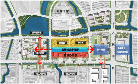 富林城道是以安全、绿色、活力、智慧四个层面打造城市活力街区,形成核心中央景观区、活力商业圈。城道街区无车行干扰,项目首层空间架空,打造集办公、创业、住宅、商业一体功能复合的双创街区,创新市集、漫游主题、城市生活季等多样的创新空间,且提供多样、复合、共享的生活服务配套空间。