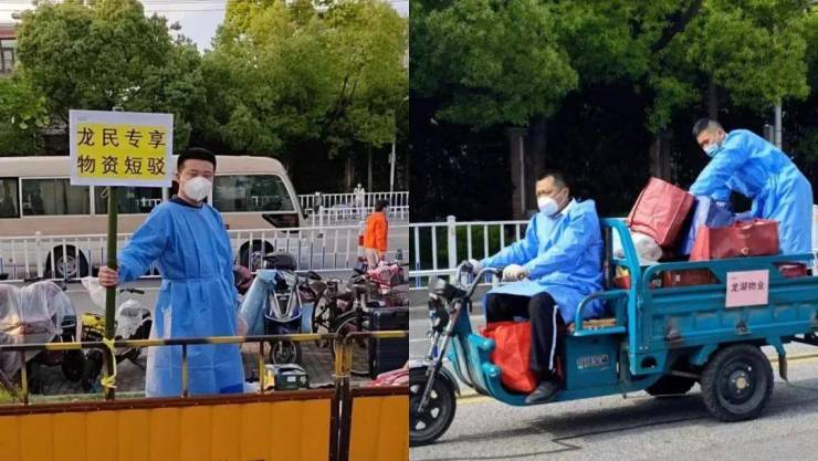 5月2日,上海龙湖滟澜山派出的物业人员,一早就来到山姆超市门前,为业主提供免费物资短驳服务,一次次往返奔波不停。