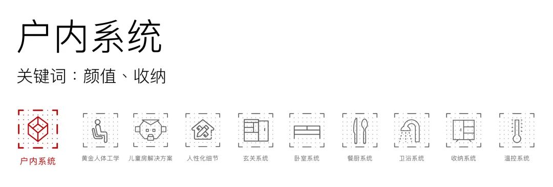 户内系统方面,象屿地产以人为本,对中国家庭结构的深入研究——家庭空间功能的使用需求,到人性化舒适度以及人体工程学的尺度研究,深入每一毫米、每一个品牌、每一个空间,从尊崇、美感、舒适度等方面满足幸福感的居住体验。从儿童房解决方案、黄金人体工学,更将室内系统不断丰富,不断细化,聚集玄关、卧室、餐厨、卫浴、收纳、温控系统,不断提升产品竞争力,带给客户更加优质的居住体验。