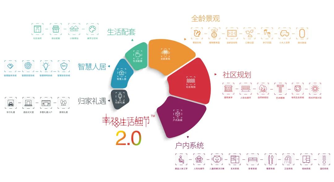 《幸福生活细节 2.0》在结合理念的同时,通过社区规划、智慧人居、归家礼遇、全龄景观、户内系统、生活配套六大产品体系,将“健康、绿色、智慧、社群”的每一个细节融入全生活场域中,从关注个体的生活家聚集群体的生活场,重塑城市、自然与人文之间的情感联结,让建筑更好地赋能生活,持续焕发生命力,提升居住者的归属感和幸福感。