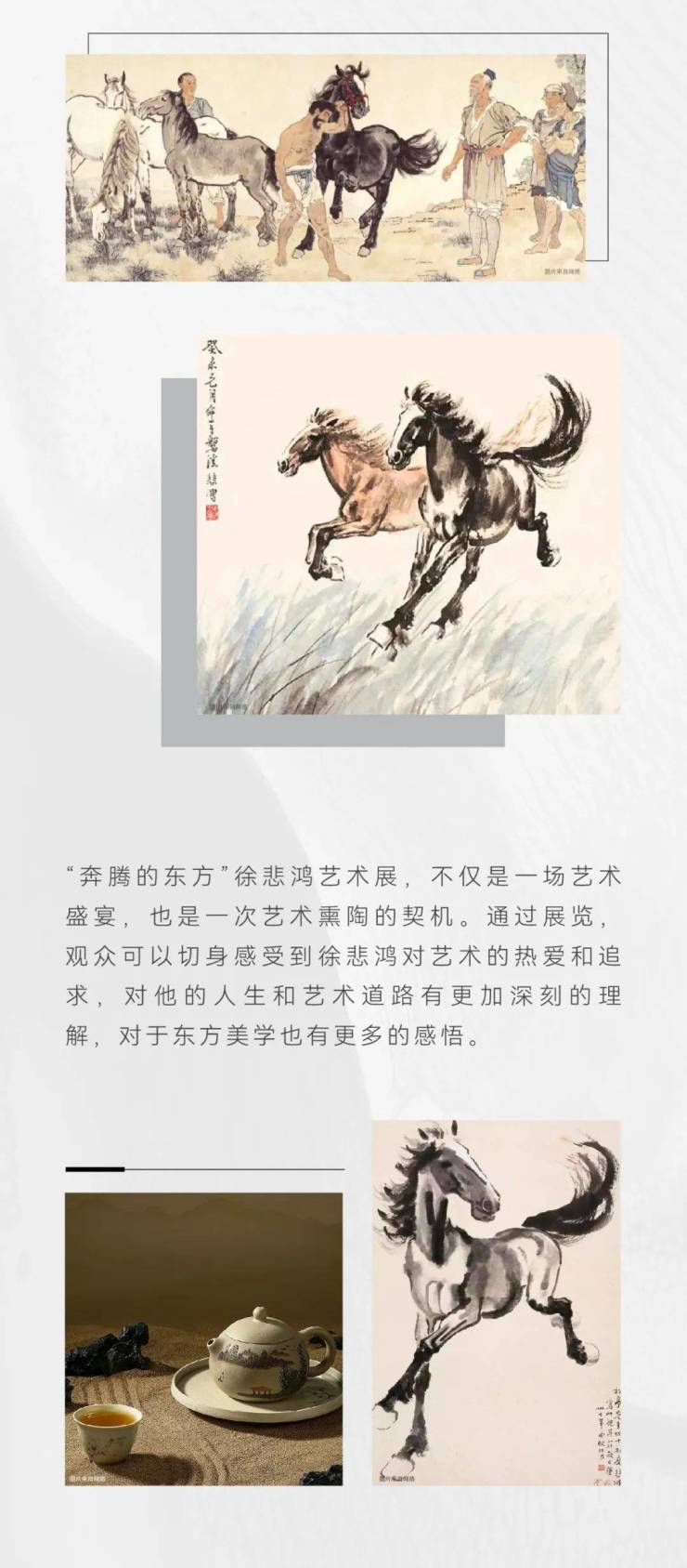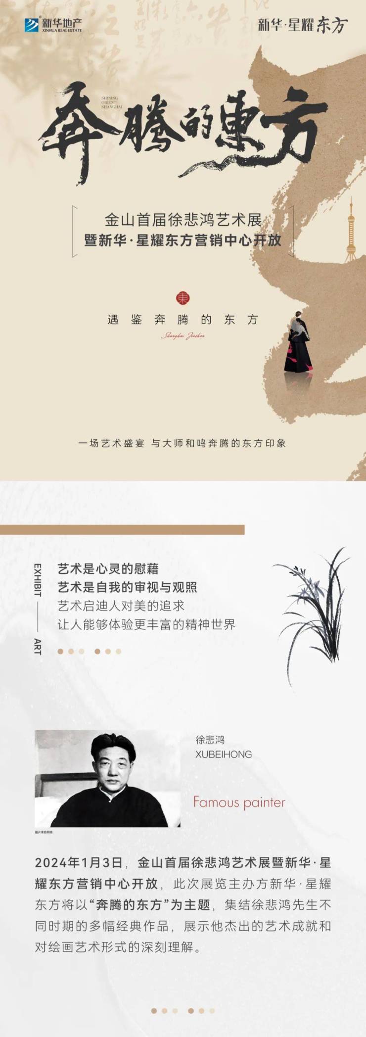 2024年1月3日,金山首届徐悲鸿艺术展暨新华·星耀东方营销中心即将开放,此次展览主办方新华·星耀东方将以“奔腾的东方”为主题,集结徐悲鸿先生不同时期的多幅经典作品,展示他杰出的艺术成就和对绘画艺术形式的深刻理解。