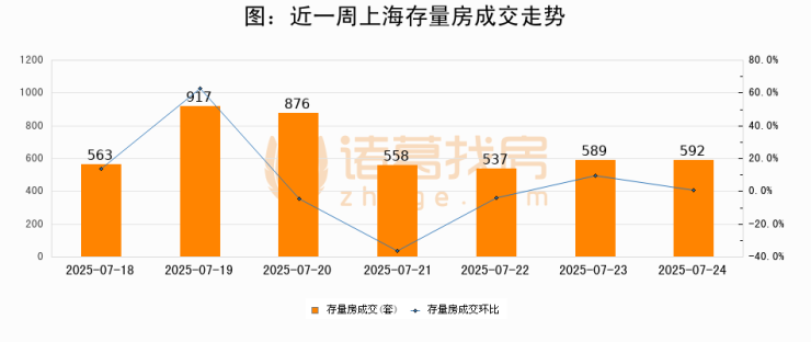 从存量房来看,2025年07月24日上海存量房单日成交592套,比昨日增加3套,环比上涨0.5%。从近一周存量房成交来看,上海存量房日均成交套数为661套,07月24日单日成交592套,低于近一周平均水平10.4%。