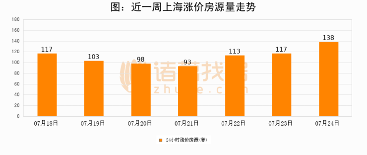 根据诸葛找房数据显示,上海24小时涨价房源量为138套,较07月23日增加21套,环比上涨17.9%。与此同时,涨价房源占比小幅扩大,业主信心有所提升。