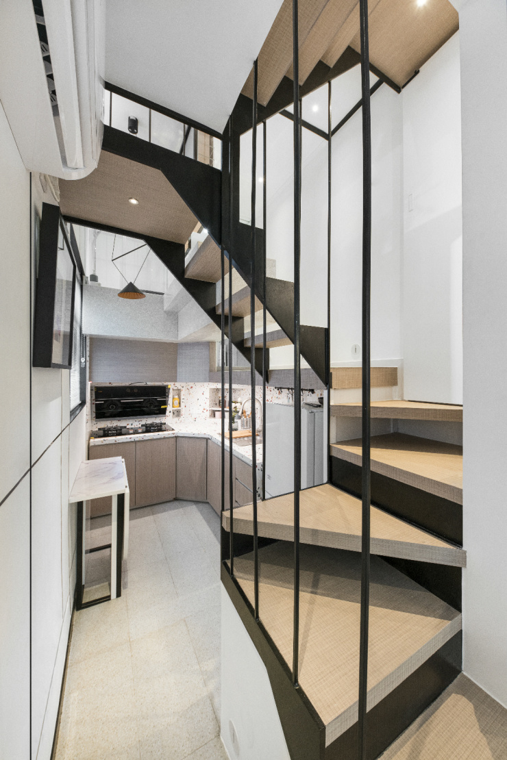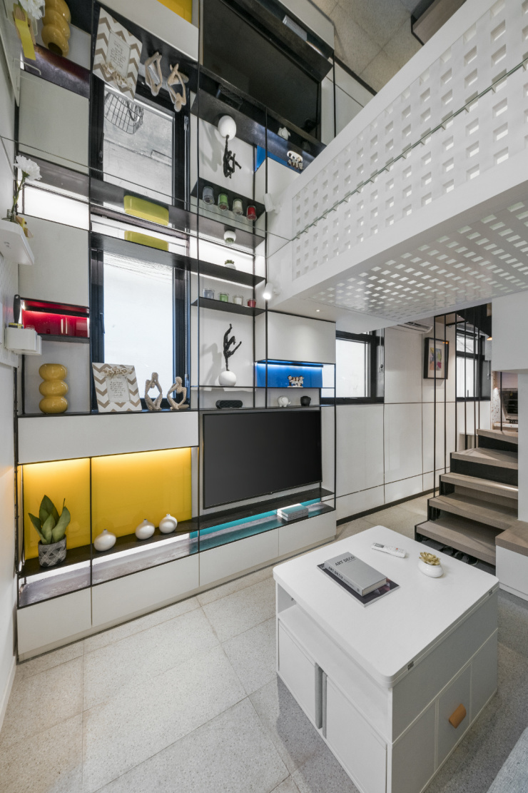 在11㎡如此狭小的空间内,针对面积小、垂直爬梯、防潮、隔热等要突破的难题,设计师史南桥开始了一场与空间的比赛。他坚持“不弯腰”的原则,利用纵向空间在“螺蛳壳里做道场”,完成了客厅、餐厅、卧室、厨房、卫生间五大功能区的布局。房屋较矮的东侧部分保留两层构架,分别用作委托人小黄的卧室和客厅;房屋较高的西侧部分分成三层,从上至下依次为父母卧室、卫生间、厨房。