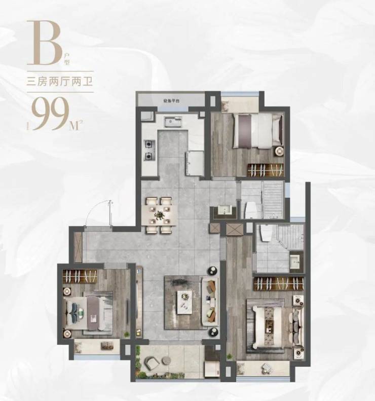 项目主推的约99㎡三房两厅两卫“飞机”户型,南北通透,客餐厅相连;卧室带飘窗,可容纳更多阳光和风景;客卫三段式干湿分离,设计贴心实用,更符合家庭成员的使用习惯;全屋几乎无走道设计,室内空间利用率非常高,尺度感远超同面积段其他产品。