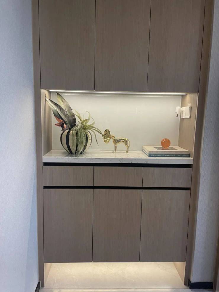 以约99㎡三房为例,“门面担当”入户玄关采用与全屋统一的木饰面,玄关柜底部留空,方便放置日常换穿的鞋子,也减少了开关柜门的频次,看似小小的细节,给生活带来许多便捷。还有一处“点睛之笔”,玄关柜中间背板为超白玻璃,可作为家庭留言板,记载生活的点滴。