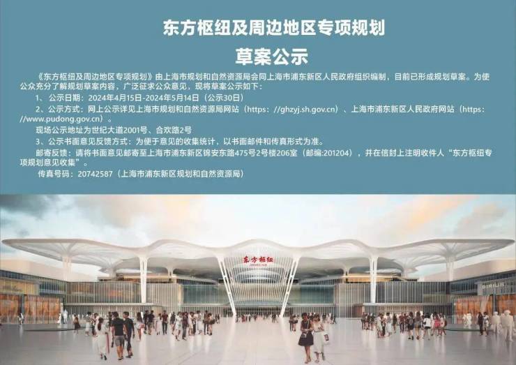 4月15日,由上海市规划资源局和浦东新区人民政府组织编制的《东方枢纽及周边地区专项规划》草案正在进行为期30天公示,向社会广泛征求意见。