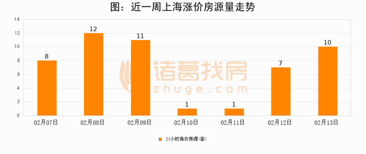 根据诸葛找房数据显示,上海24小时涨价房源量为10套,较02月12日增加3套,环比上涨42.9%。与此同时,涨价房源占比小幅扩大,业主信心有所提升。